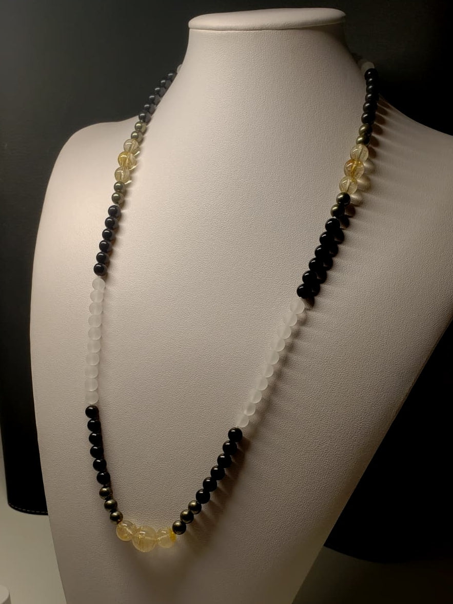 Just as we know it takes a combination of things to maintain good health - so we decided to approach our EMF Protection Therapeutic Design Necklace. We have selected a combination of gems known for their naturally occurring properties of EMF Protection and combined them with Rutilated Quartz enhanced with a proprietary infusion of neutralizing effects of EMF.