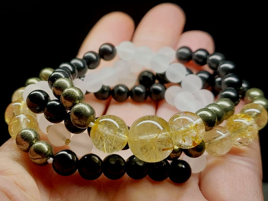 In the description above the amount of Infused Rutilated Quartz will be listed along with the size of the Shungite and Frosted Quartz (either 6mm or 8mm).