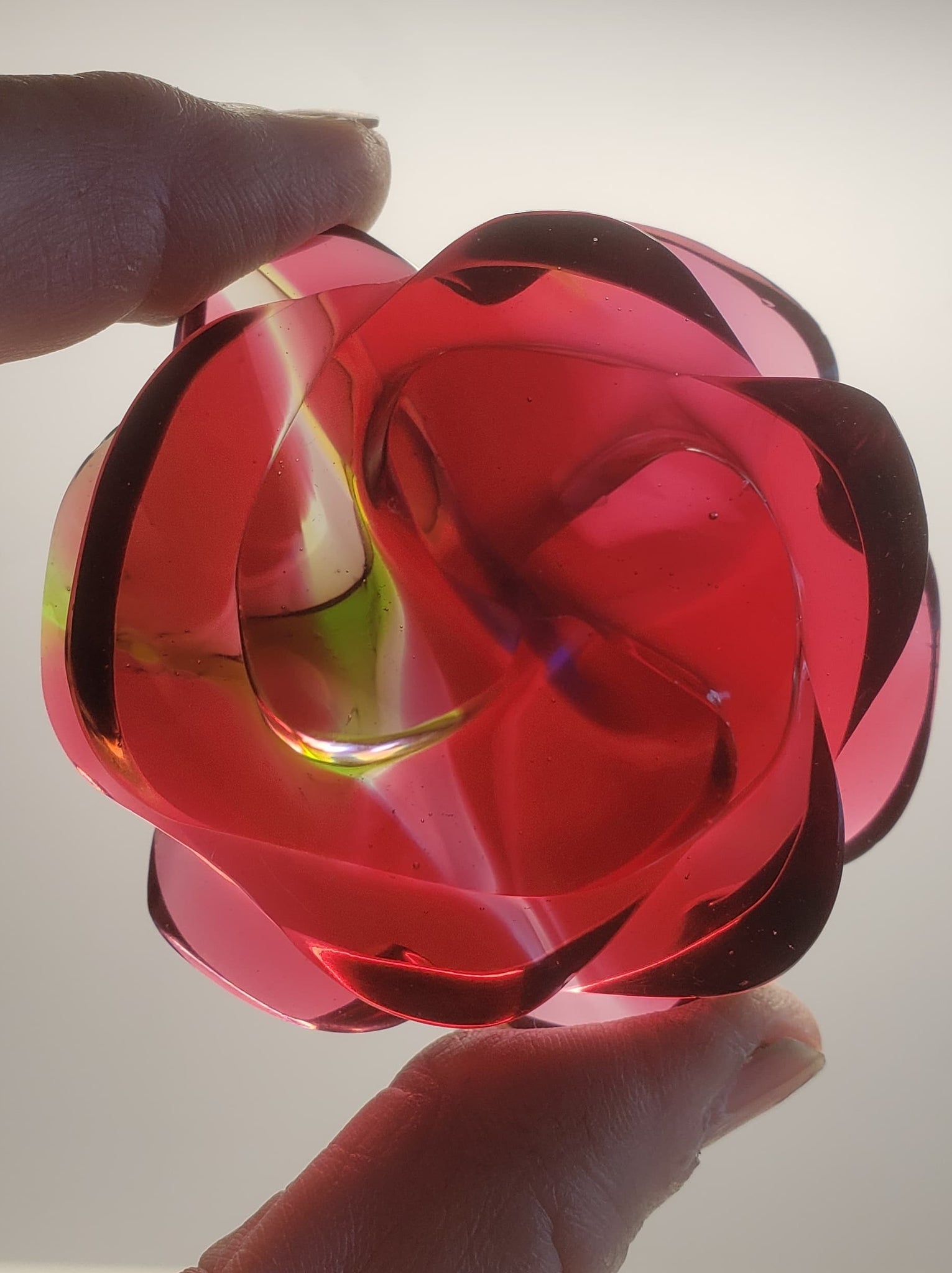 THIS ROSE IS SUPER UNIQUE WITH LOWER PETALS BEING  ROSE PINK COLOR IN A BASE OF RED.  PLUS IT HAS A WHITE WITH GREEN STRIPE SWIRLING WITHIN.